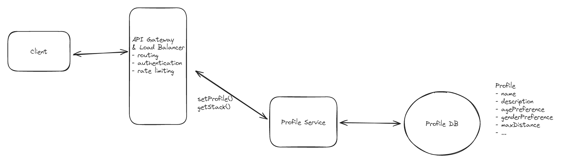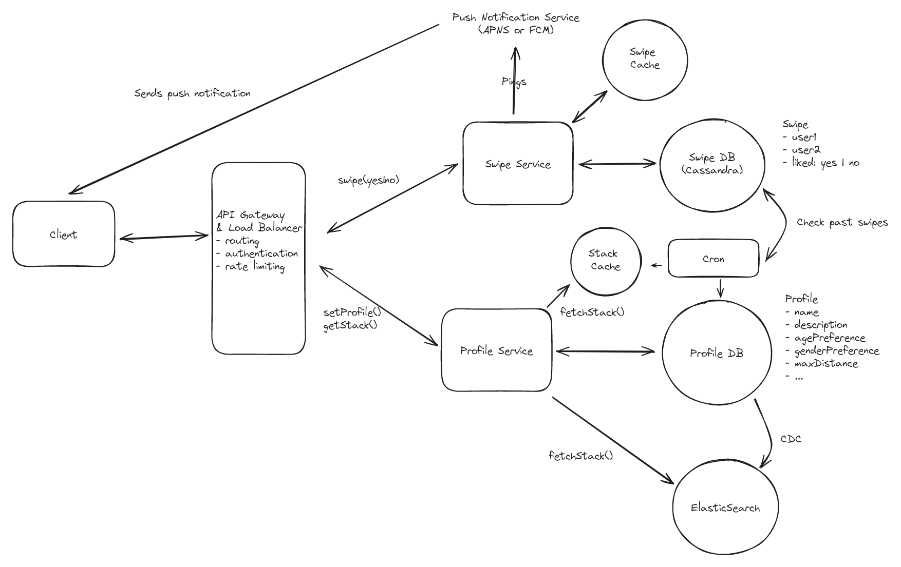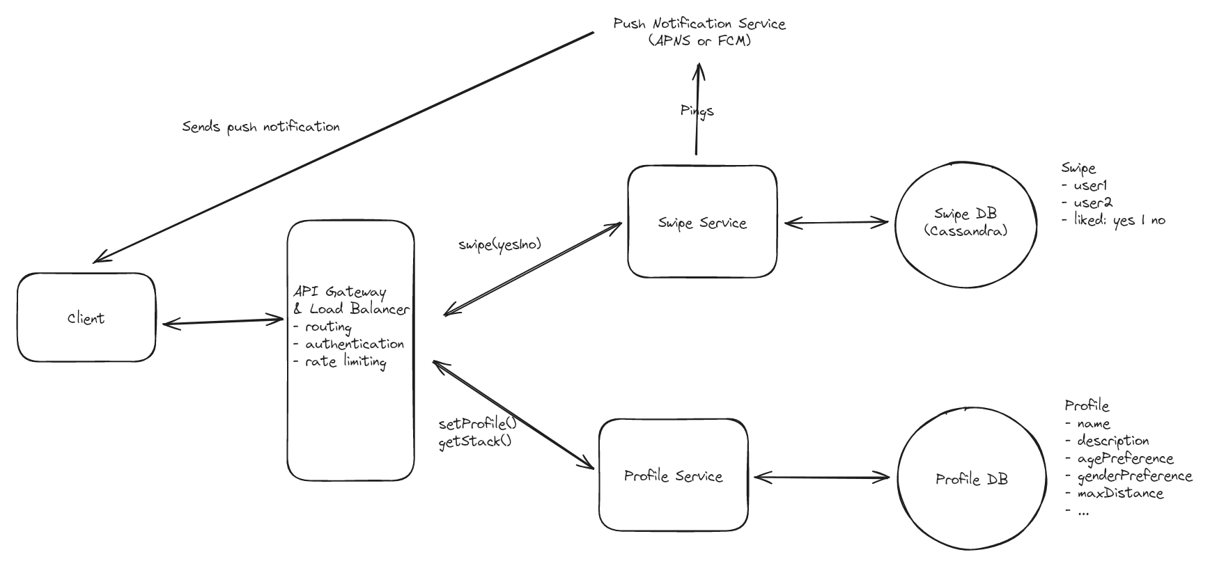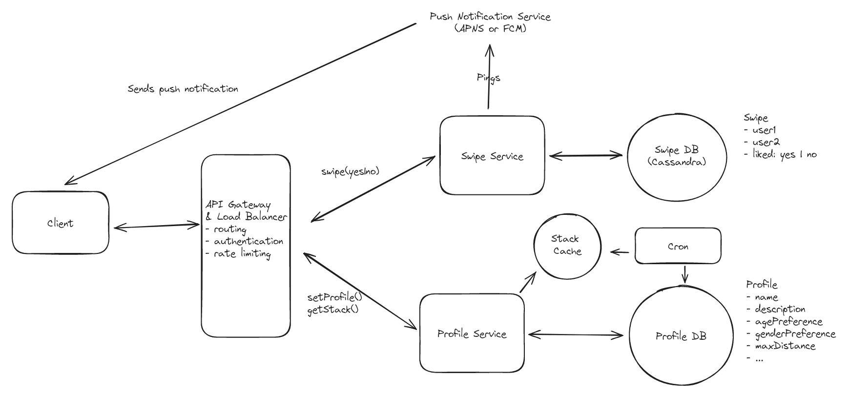 - The client sends a POST request to /swipe with the profile ID and the swipe direction (right or left) as parameters.