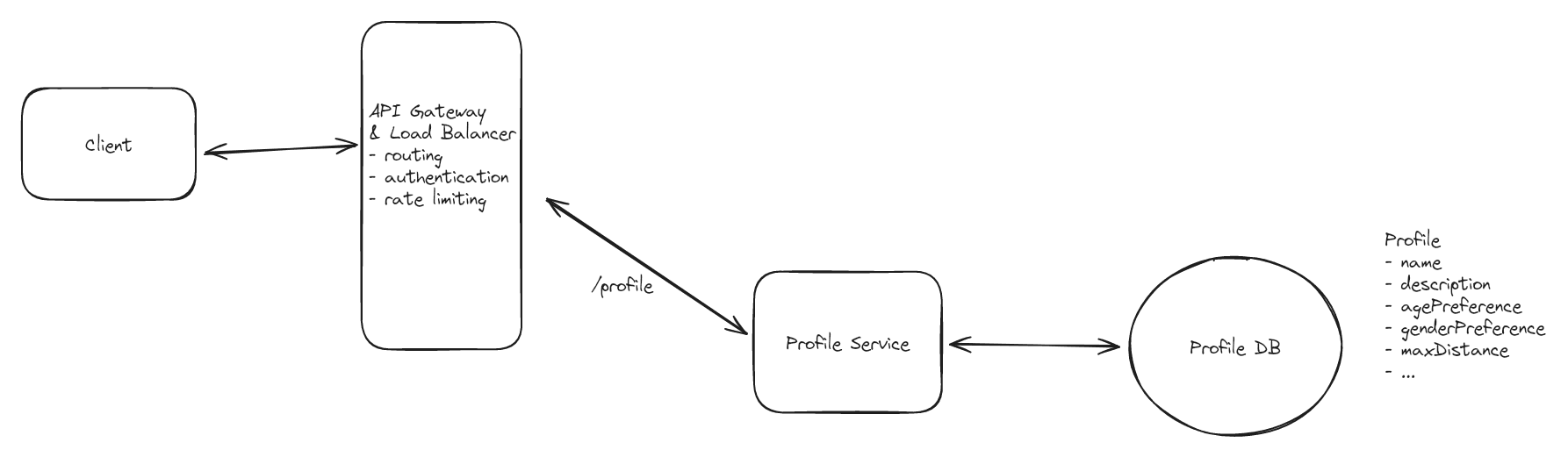 The easiest thing we can do it just query the database for a list of users that match the user's preferences andreturn them to the client. We'll need to also consider the users current location as to make sure they only get serves profiles close to them.