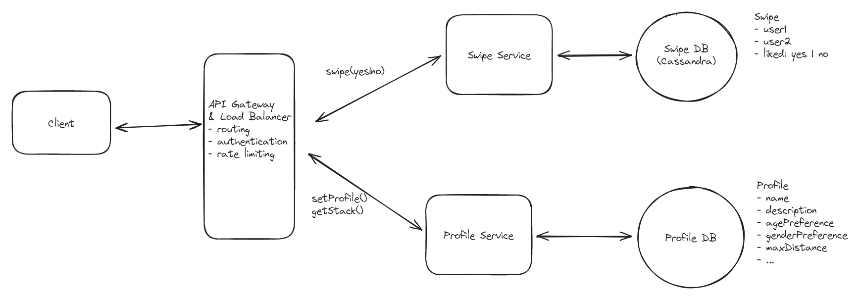 We need a way to persist swipes and check if they're a match. Again, we'll start with something simple and inefficient and improve upon it during our deep dives.